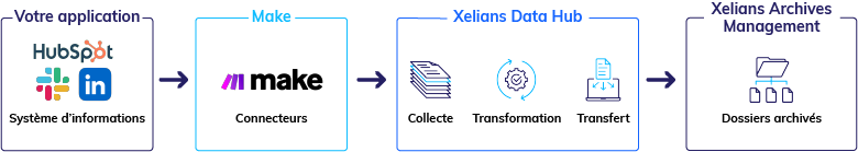 Grâce à Xelians Data Hub disponible sur la plateforme d’intégration de services no-code Make vous pouvez dorénavant archiver très simplement dans le SAE Xelians Archives Management les données des principales applications cloud.