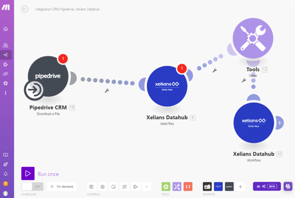 L’image ci-dessus illustre l’interconnexion réalisée dans Make entre le CRM Pipedrive et Xelians Data Hub afin d’archiver les documents déposés dans le CRM.