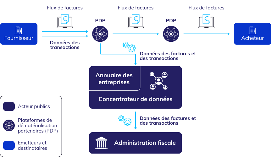 Les Plateformes de Dématérialisation Partenaires (PDP) : il s’agit de plateformes privées reconnues par l’Administration fiscale. Seules ces plateformes peuvent transmettre directement les factures électroniques à leurs destinataires et transmettre des données au PPF.