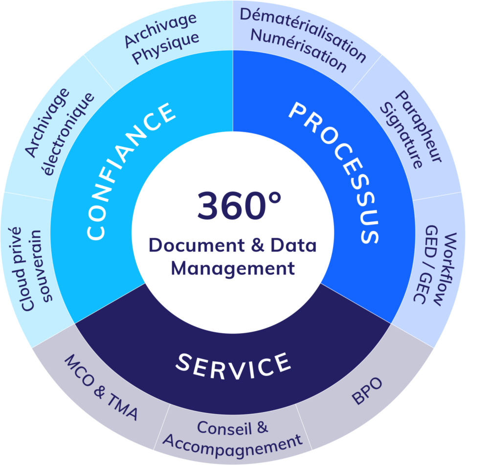 Par une approche à 360° basée sur le data management, nous nous positionnons comme l’interlocuteur unique dans la gestion documentaire grâce à l’ensemble de nos prestations sur toute la chaîne documentaire